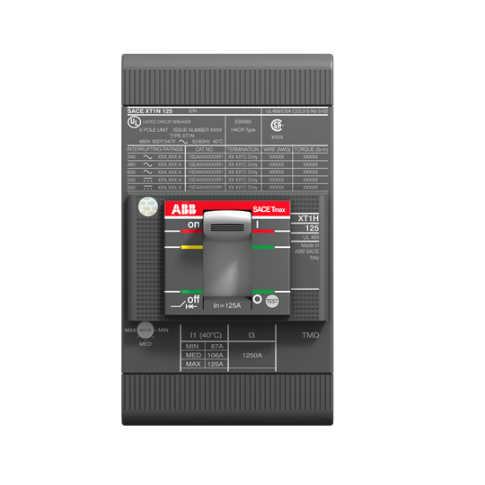 • Extended Description: Tmax Breaker Frame Size XT1N 125 Thermal Magnetic Fixed 25-500 Three-Pole Fixed + Front Flat Terminals Underwriters Laboratory/Canadian Standards Association
